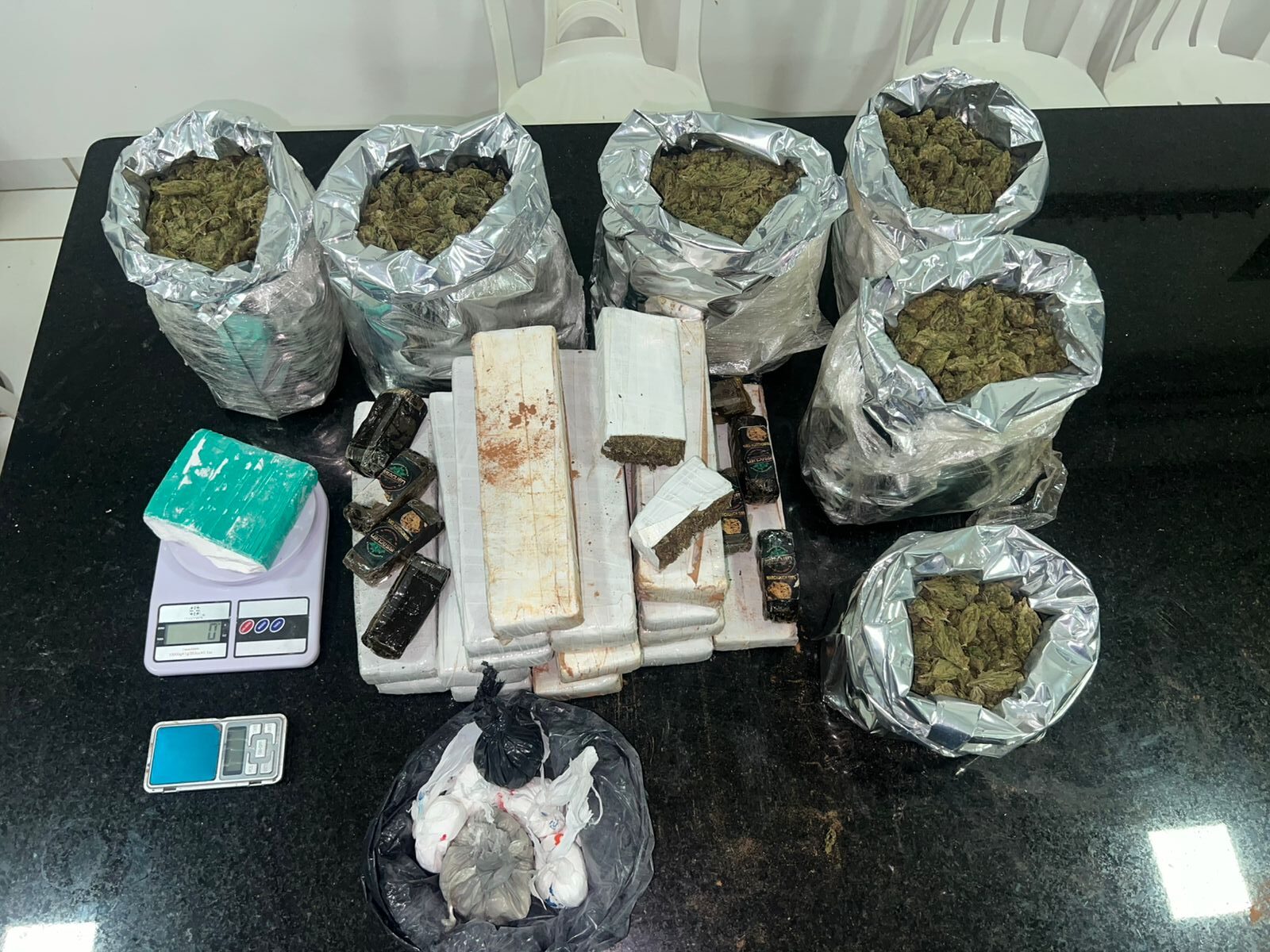 Com eles, foram apreendidos 11,239 kg de maconha prensada, 5,643 kg de maconha tipo Skunk, 894 g de cocaína, 715 g de haxixe, um carro, duas balanças de precisão e uma faca.